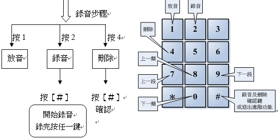 2. 按99992#後開始錄音,錄完音後請按任意鍵結束錄音,試聽按1、刪除按4#